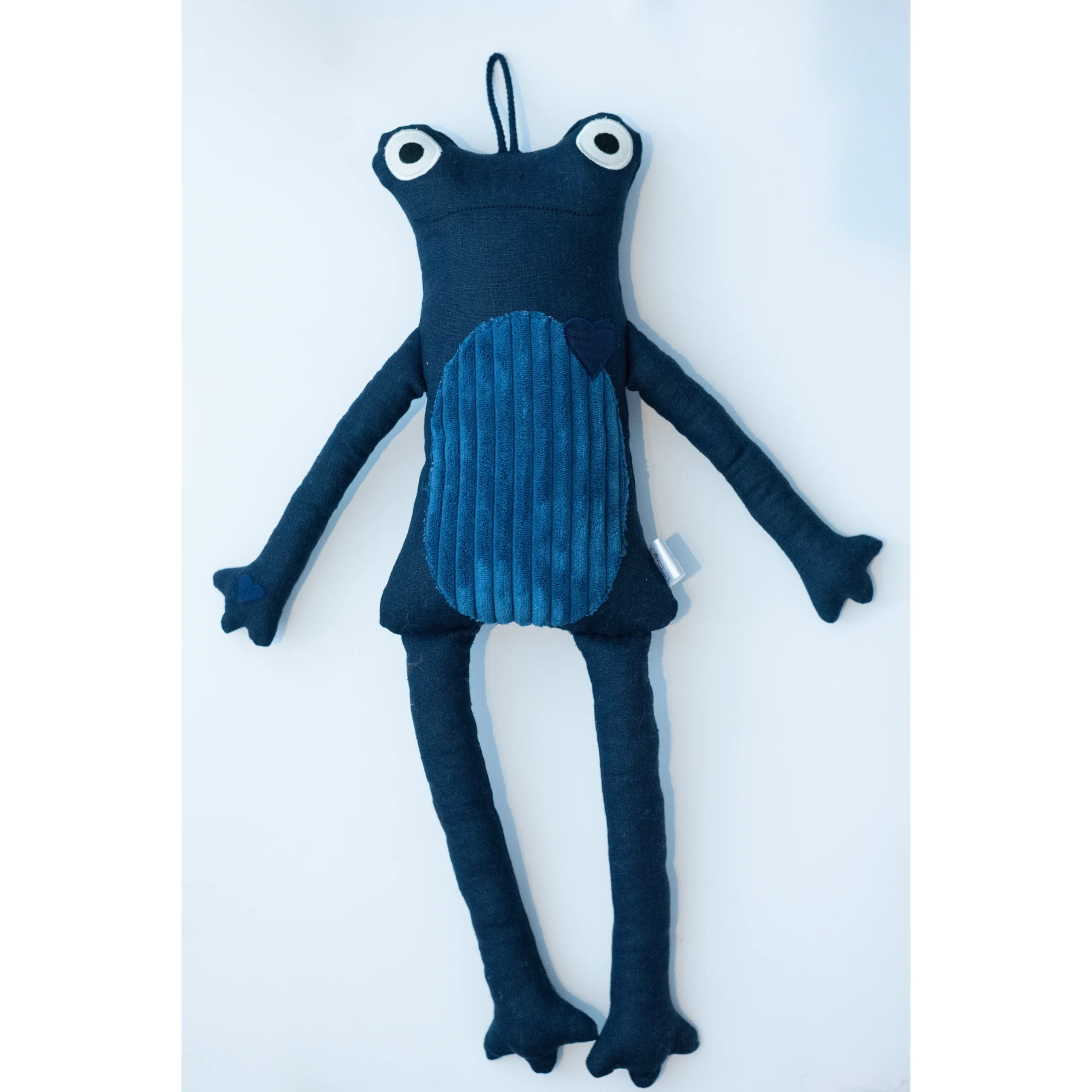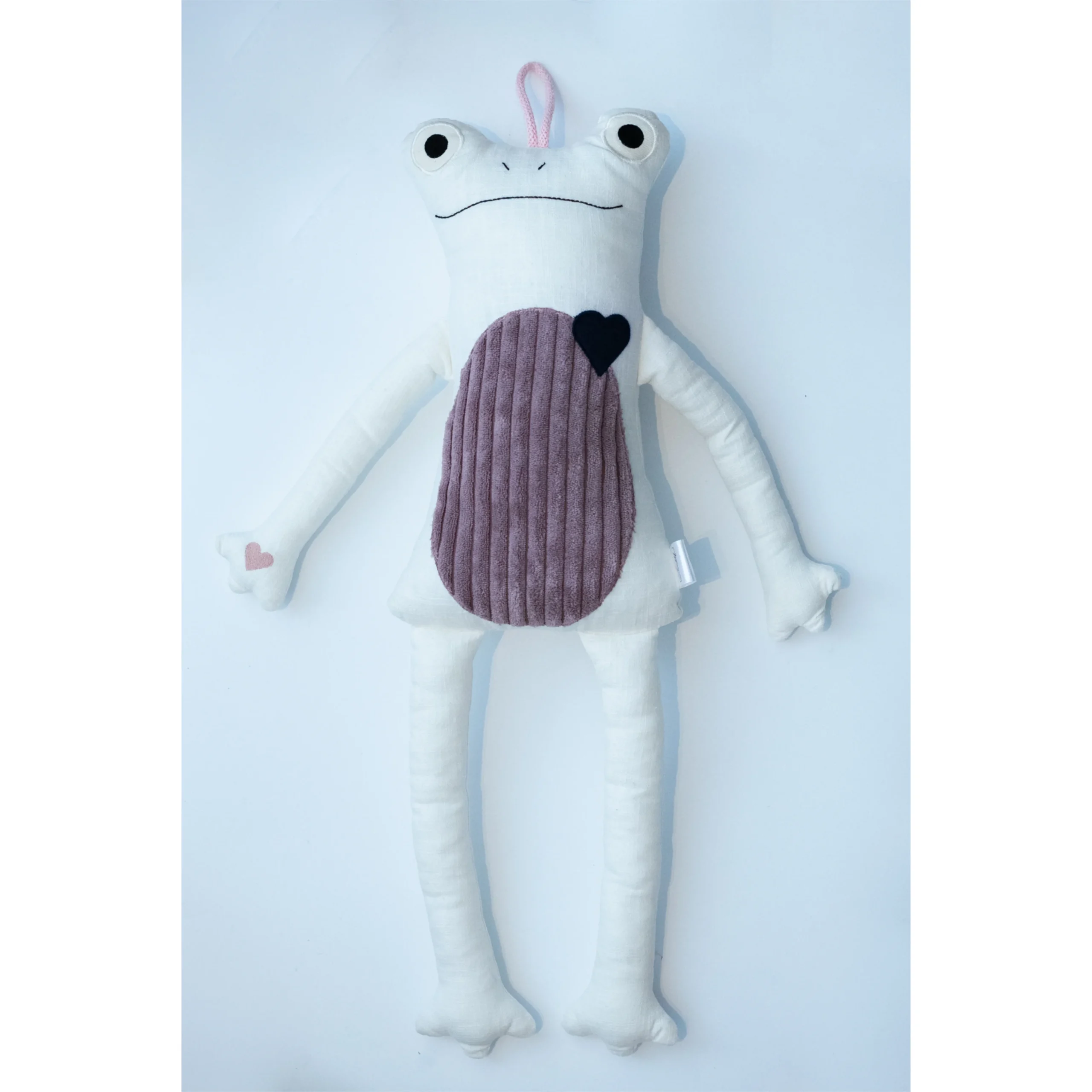 Każda żaba jest szyta z wysokiej jakości lnu, z sztruksowym brzuszkiem i haftowanymi detalami – bez plastikowych elementów.